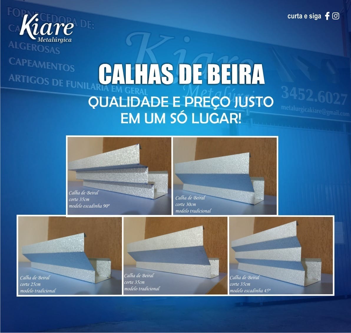 Sempre zelando pela seriedade e atuando com qualidade e profissionalismo no ramo da metalurgia na modalidade buit-to-suit (sob medida), hoje a Kiare Metalúrgica conta com uma estrutura e uma equipe qualificada para montagem de pedidos, sendo referência na região, no mercado de fornecimento de calhas, algerosas, capeamentos, bem como de chapas laminadas e bobinas sliter para funileiros, construtoras e consumidores finais.
